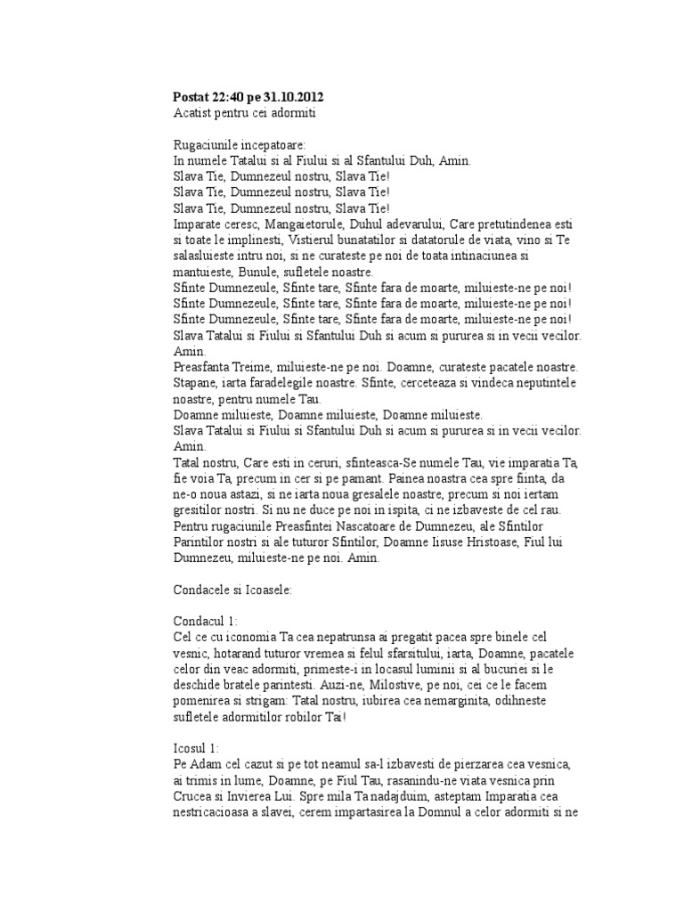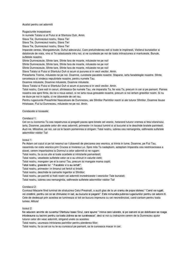 vizitati articolul complet aici : https://www.slideshare.net/fericitbarbatul/acatist-pt-cei-adormiti-13 Tatal nostru, iarta celor ce au varsat sange nevinovat; Acatist, orthodox, icoane, ortodox, religie, crestin, roman, romania, romanian. Imparate ceresc, mangaietorule, duhul adevarului, care pretutindenea esti si toate le implinesti, vistierul bunatatilor si datatorule de viata, vino si te salasluieste intru noi, si ne curateste pe noi de toata intinaciunea si.