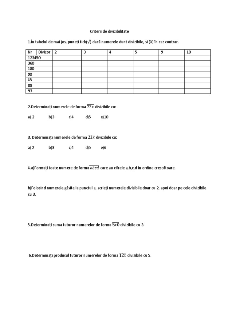 vizitati articolul complet aici : http://pro-didactica.ro/forum/index.php?forumID=12&ID=32838 Orice număr care se termină în 0, 2, 4, 6, sau 8 este divizibil cu 2. Un număr natural este divizibil cu 25 dacă numărul format din ultimele două cifre ale sale se divide cu 25. Scădeți ultima cifră de două ori restul.