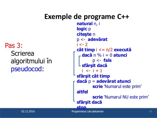 vizitati articolul complet aici : https://slidetodoc.com/algoritmi-elementari-pentru-prelucrarea-numerelor-n-pseudocodc-1/ It is written in symbolic code which must be translated into a programming language before it can be executed. Once you figure out the idea, then you translate it to your so if you were to write pseudocode in c++, it wouldn't be pseudocode anymore, it would be (fully. Help me please, i don't really get how to write this into pseudo code.